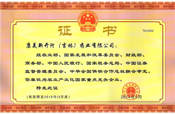 康美新开河于2004年12月被认定为吉林省农业产业化重点龙头企业,2011年12月被中央八部委联合认定为第五批农业产业化国家重点龙头企业。2014年是康美新开河被认证为农业产业化国家重点龙头企业后的首个监测年份,今年4月,康美新开河向吉林省农业委员会提出监测申请,并组织报送监测材料,在吉林省前期初步监测的基础上,9月18日通过专家审核和全国农业产业化联席会议审定,顺利通过监测。此次监测的顺利通过,是对康美新开河近年来农业产业化工作的肯定,为康美新开河新的国家级农业产业化项目的发展奠定了坚实基础,增强了康美新开河在业内的影响力。
