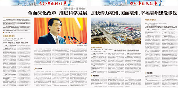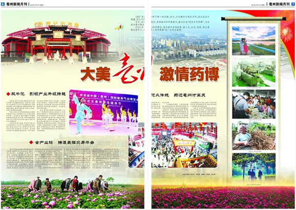 9月23日,《市场星报》用了8版9版两个整版刊登了专访市委书记、市人大常委会主任杨敬农的文章《全面深化改革 推进科学发展 加快活力亳州、美丽亳州、幸福亳州建设步伐》。其中,配图采用的即为以康美中药城为前景的南部新区全景图,配图中,康美中药城宛若一朵盛开的红芍花,娇艳耀眼。