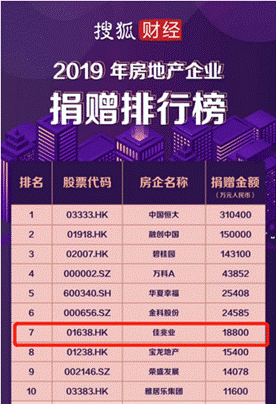5月14日,搜狐财经独家发布《2019年房地产企业捐赠排行榜》,榜单涵盖于A股、H股上市的数百家房地产公司,并从中选出2019年度对外捐赠总额最高的100家企业。佳兆业集团以1.88亿元人民币捐赠金额位列百强榜第七位。