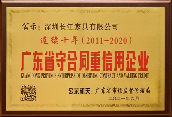 近日,2020年度广东省“守合同重信用”企业公示名单揭晓,凭借着诚信守法的良好信誉、严谨规范的合同管理体系以及良好的经营效益,深圳长江家具有限公司顺利通过广东省市场监督管理局的最终评审,连续十年荣获“广东省守合同重信用企业”荣誉称号。