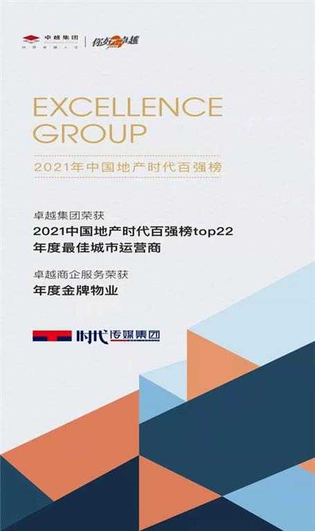 2021年11月16日,由广东时代传媒集团主办,时代周报、时代财经等媒体支持承办的2021中国地产时代百强论坛在广州丽思卡尔顿酒店圆满落幕。在现场最受瞩目的颁奖环节,卓越集团以强劲综合实力,摘取年度最佳城市运营商殊荣;卓越商企服务以突出服务水平,荣获金牌物业奖。凭借不俗的年度经营业绩,卓越集团更荣登2021年中国地产时代百强榜TOP22。