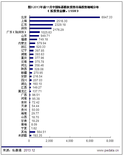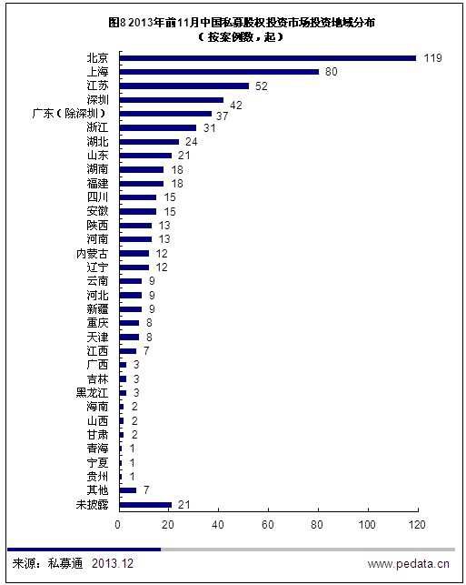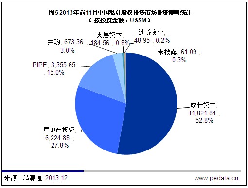 从投资策略来看,2013年前11月成长资本、PIPE(投资上市公司)、房地产投资三种策略占据全部策略类型的95.0%以上。其中,成长资本410起,房地产投资101起,PIPE投资77起,披露金额的投资交易分别有367起、97起、75起,房地产投资的平均单笔交易规模达到6,417.40万美元。1-11月还发生并购投资14起,平均单笔投资规模也超过5,000.00万美元。