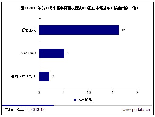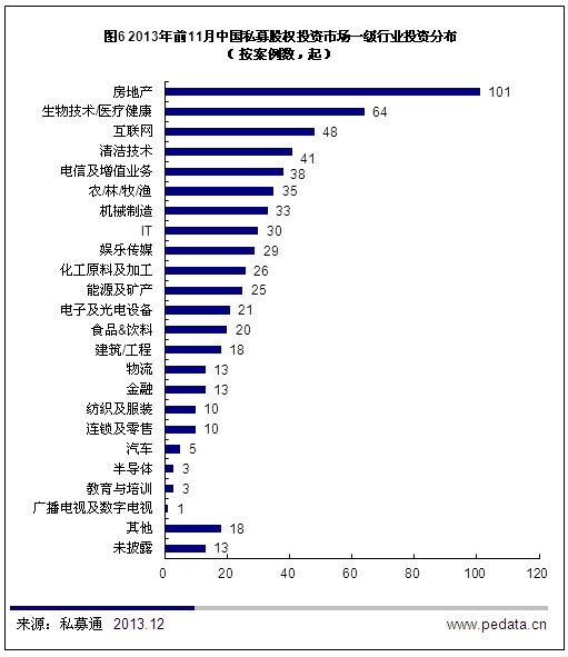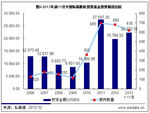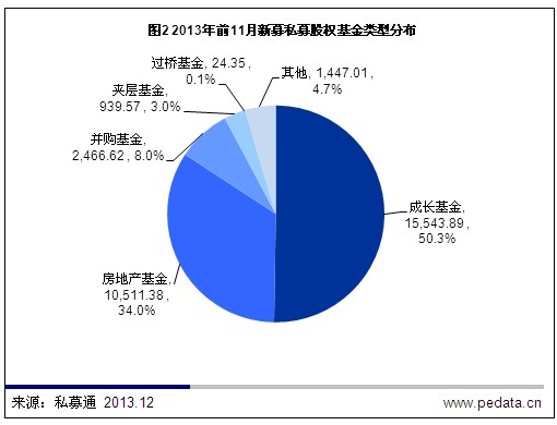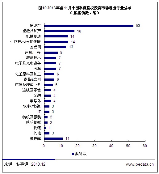 大中华区著名创业投资与私募股权研究机构清科研究中心近日发布2013年前11月中国私募股权投资市场数据统计结果。数据统计显示,2013年前11月中国私募股权投资市场共新募集完成329支可投资于中国大陆地区的私募股权投资基金,募资金额共计309.33亿美元,数量与金额均较去年同期有所回温;从新募基金的币种来看,人民币基金数量仍然占据绝对优势,金额则与外币基金成七三开格局;从新募基金类型分析,房地产基金为2013年增长最迅猛的基金类型,数量与金额已渐与成长基金成分庭抗礼之势;从投资情况来看,2013年前11月中国私募股权投资市场投资交易数量与去年前11月基本持平,投资金额增长25.4%,共发生私募股权投资案例618起,其中披露金额的565起案例共计投资223.70亿美元,房地产成为投资最活跃行业;前11月共发生退出案例195笔,其中IPO退出均发生在境外市场,共计发生23笔,并购退出以57笔成为机构最主要退出方式,共占全部退出数量的29.2%。