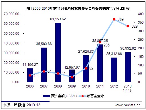 清科研究中心统计,2013年前11月共有329支可投资于中国大陆的私募股权投资基金完成募集,其中披露金额的321支基金共计募集309.33亿美元,募集数量同比增长1.9%,募资金额同比增长39.9%,实现触底反弹。募资金额的增长主要源于房地产基金募集的活跃,此外不少大型外资机构在本年度完成了投向中国/亚洲市场的美元基金,也带动了募资市场的复苏。