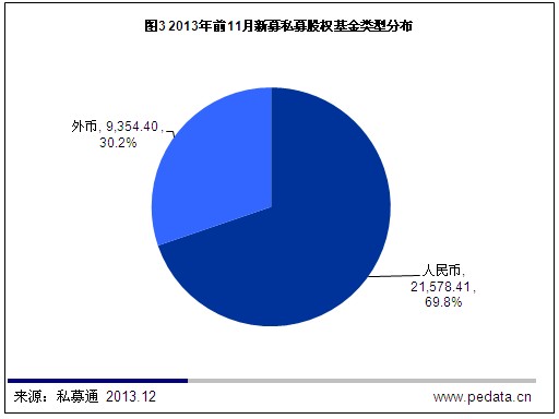 2013年前11月的新募基金包括人民币基金305支, 其中披露金额的298支募资总额为215.78亿美元,外币基金新增24支,共计到位93.54亿美元。其中,鼎晖投资的鼎晖中国美元基金V年内募集到位超过18.00亿美元,成为年度最大单支基金。