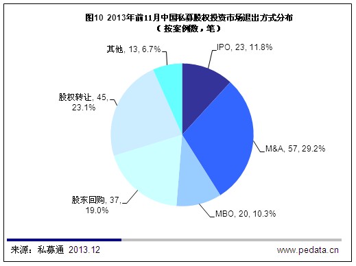 2013年,境内IPO经历了历史上最长的空窗期,在主退出渠道阻塞的情况下,前11个月退出市场呈现多元化态势。其中并购退出成为最主要的退出方式,发生案例57笔,占全部案例数的29.2%。此外,股权转让与股东回购各发生45笔与37笔,管理层收购发生20笔。前11个月境外IPO发生退出案例23笔,其中香港主板实现退出16笔。